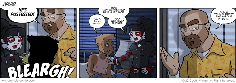 So George isn't a zombie again. And he was just feeling under the weather... The deal is he's still readjusting to normal human life and he hasn't been sick in something like fourteen years... That was a helluva streak. My current plan is to have this story of George being sick lead into the next arc that will lead us to some career opportunities for our favorite former zombie.