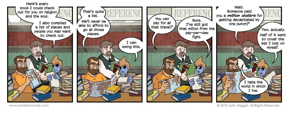So John and George are going around the world in search of a soul for a zombie. Monday they square things away and starting Wednesday they're on the road. They'll encounter all sorts of characters from myth, story, and film. It's something that has been in the works for months and we're very excited about it. We hope you will be too.