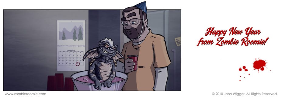 Last year I wasn't sure whether or not to do something specific to New Year's or New Year's Eve parties... this year though, I've got a storyline that will start on Monday that revolves around the events that happened during the guys' New Year's party. Said event isn't this. I hope you guys are safe in whatever festivities you partake in tonight... If you drink, don't drive... If you have a mogwai don't get him wet or let him eat after the ball drops. What timezone is that supposed to be anyway? Or if you do, send them after Dick Clark. I'm amazed he's still alive... surely some gremlins could rectify that.