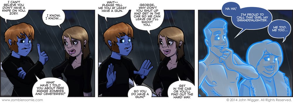 Like a Marvel movie, you need to stay to the end to get the last bit out of an arc. That's my thinking on the after the credits scene strips... Not every arc gets both an epilogue strip and an after credits scene strip... but this one had both planned and I think you'll agree it was worth it. I've come across a new way to do the ghost effect, while working on promo art featuring Drew, so when I decided to have Grampa and Granny McGillicuddy show up for this end of the arc strip... I knew It'd be a great time to test it out. I think they came out swell if I do say so myself. There's a lot to this strip that I like. George's hair really feels wet to me. There's something about Zoey that just works as well.... and like I mentioned before the new ghosts... Speaking of new ghosts... I thought about letting Granny get the Hayden Christensen/ Vader Force ghost treatment ala current Star Wars Blurays... but nah, she's how she was when she died. With Disney releasing the old school versions on Bluray soon, it's appropriate. Plus, Grampa gets his head back together in one piece as a ghost, so that was enough of a change.