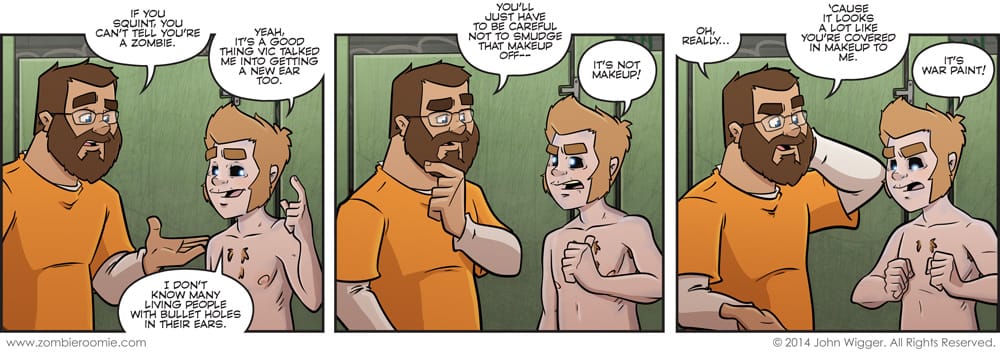 I knew I was going to have George caked in makeup for this portion of the arc, but I wasn't sure where I'd have it occur. I thought about having him do it before they left, but I wanted them already on the road. The last time the gang went west, they stopped for Lyn to use the restroom... so I figured it could easily be the same gas station/rest stop where George put on his war paint. Ever since George got rezombified, he's had a messed up left ear due to Zoey shooting it. I planned on George getting it fixed for a while, but the Vic/Body Shop bit took a while to get to, so it just got put off. Reveals regarding Zoey's family emergency next week. I think I've tortured you guys enough.