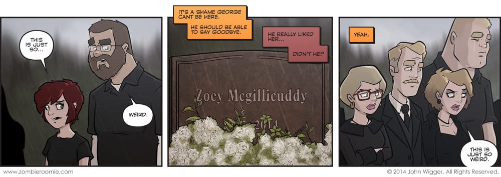 Today's comic blows every theory I've seen you guys put forward out of the water. Zoey's Dad is alive and well. Still anti-zombie, but alive. We jumped ahead a little for this strip but Wednesday we'll go back to explain how we got here. It's a storytelling device... one that I liked when I was laying out the rest of the arc. Plus it gave us the reveal that her Dad was still alive and tipped the arc on it's head.