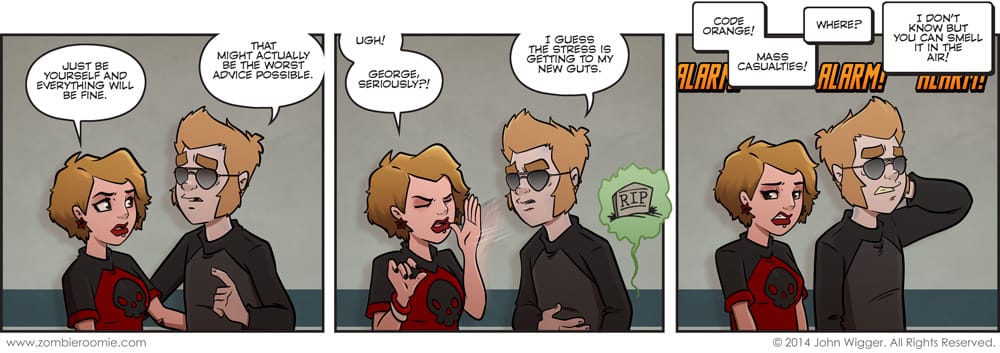 Okay after our trip to the near future for Monday's arc, we're back closer to where we were before. The gang has made it to the hospital and Zoey is trying to calm George's nerves. I thought about having the third panel just be the inclusion of some sassy, black receptionist saying something like, "Mmmhmmm..." but I thought that was too on the nose. The mass casualties bit was less sitcom-y. Things will finally be revealed Friday.