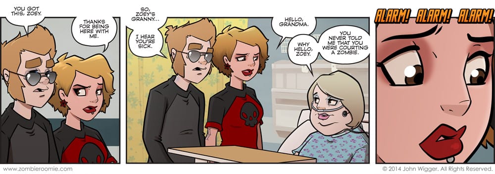 I finally reveal Zoey's Grandma. Several people correctly guessed that Zoey is indeed named after her and that the tombstone we saw on Monday will be hers. When you introduce a character only to have something bad happen to them, it typically doesn't work well. As a storyteller, you haven't earned the gravitas you're searching for. I knew this so that's why I came right out and showed her funeral already. As an audience you're already prepared for her death and the strips we have with her up to that point we saw from the future should have more meaning. At least that's my thinking. I'm excited for the part she will play, however brief. If you're in a part of the world that likes to blow shit up today, be safe.