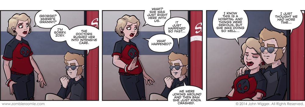 I didn't want to have Granny's turn for the worse happen "on screen" as so many people like her. It didn't seem "right" to do so. We're almost done with this arc... We should be wrapped up next week and there might be some one offs or something quick before getting into another story bit. Zoey's college stuff should pick back up before too much longer as classes are starting in the real world, but due to this arc happening in something like two or three days we haven't caught up to real time yet. I don't know what story I'll do next, I have to sit down and see what needs done and what the tones of the various planned arcs are... since I'd rather not do another downer arc right away. We need some happys around here after this story.