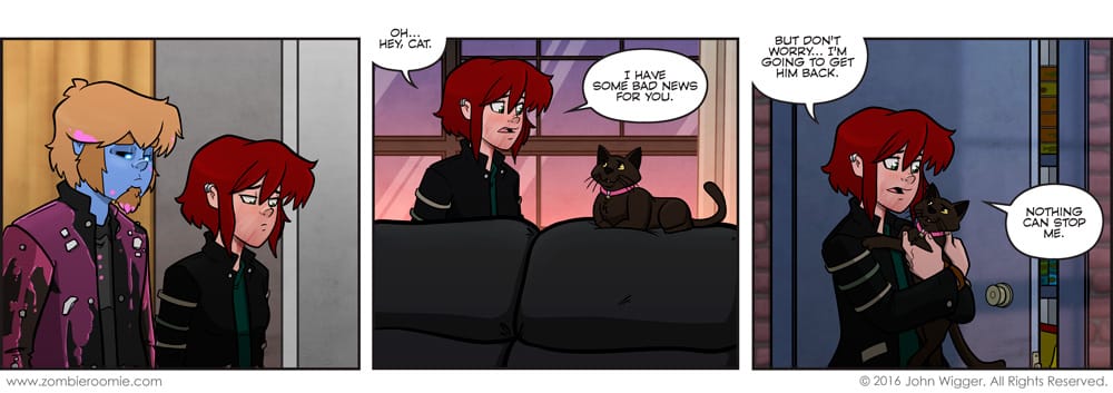 I decided we said what needed to be said in the arc so we're done with it. There are tons of loose threads that will spin into future plot lines, but I'm happy with this arc and what occurred. Since we've already had enough sad Lyn, I decided she'd find the ring off panel. It'll be addressed in a future strip, but yes, the choice of location for the third panel was a huge callback.