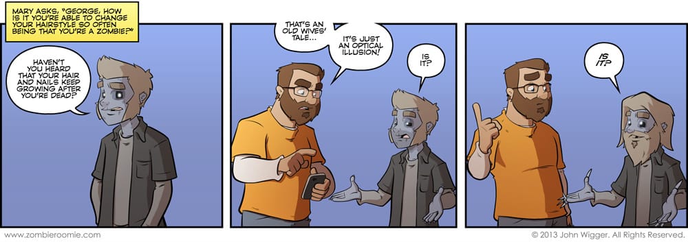 I like doing these Ask the Cast strips when I get something good that works as a joke in this kind of setup but wont really work well in a normal Zombie Roomie story style strip. They're 4th wall breaking so not necessarily canon, so I don't have to worry about things carrying over to the regular comics all the time. Case in point, George's Howard Hughes-like appearance in the third panel... that's not sticking around. I've been toying with changing George's wardrobe though... This get up might stick around. I need to find something to stick John in though... he's been wearing this shirt combo for a long, long time.