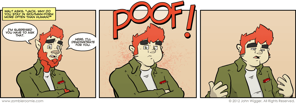 I've only shown Jack as a human a couple of times... here and here, but apparently it was notable enough for reader Walt to want to know why he stays as a wolfman. There originally was going to be a little more explanation in panel three, but my buddy Ty thought it was much funnier if I just left it with his funny expression and no additional text. I tend to agree.