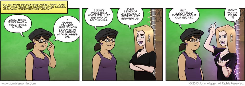 I've been asked the question regarding Lizzy's glasses every time she's been in the strip with glasses on since Glenda magicked up her peepers. Hopefully now that it's been explained in the strip folks will understand her motivation. Even though I'm the one who came up with it, I think it's sweet that Lizzy and Glenda have stuff that they're keeping for themselves... Plus this way Glenda isn't being bugged by the others to do magic for them due to it.