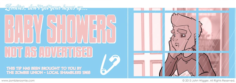 I don't do these "A Zombie's Survival Guide" comics as often as I used to do... but sometimes something is in my joke/idea file that works best in this format. Today's perusing of the notepad files came upon the two words: Baby Shower... I don't know when I wrote that, but I immediately remembered the gag behind it. When I do the AZSG strips I try different things with them that I wont do in a normal Zombie Roomie strip. I wanted something a little more graphic for this and the idea of doing it really, really blue was something different. I originally had it all spot blacks, but the baby colors connection worked better. It was way, way creepier....