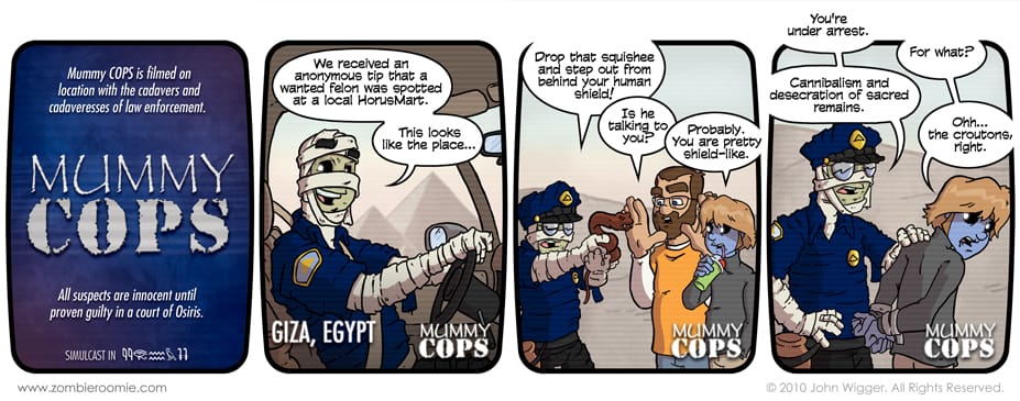 This comic relies heavily on the past strips, "High Fiber Content" and "It's not easy being Green". COPS may be my Mom's favorite show, so I often have seen many an episode when I sit and watch television with her. Though there aren't any mummies on the force in the episodes I've seen, I haven't seen any from Egypt... so who knows? We continue with George and the mummies this week, so expect more bandaged bad guys for our heroes to deal with.