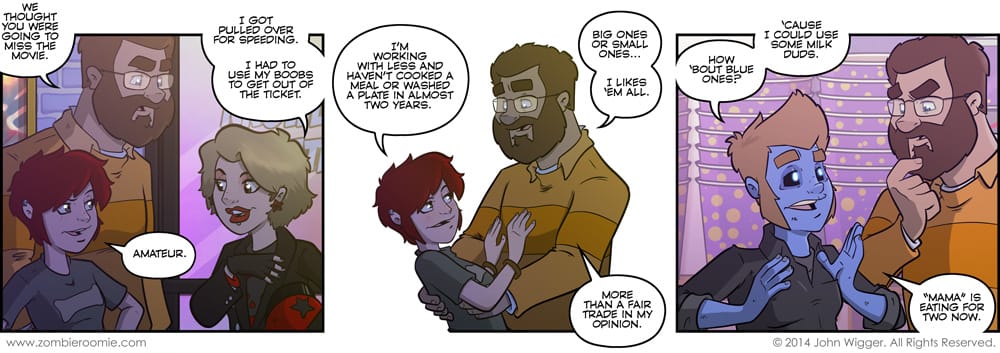 Inspired by real life events... well the usage of boobs to get out of a ticket at least. Earlier in the week one of my friends relayed the news of her evening and getting out of a ticket with her boobs. I thought that with the story that was starting on Monday... that borrowing that to set up a gag was comic fodder. Since I've gotten a few inquiries about it, yes... George is carrying Cthulhu's baby. I told you it was going to get weird.