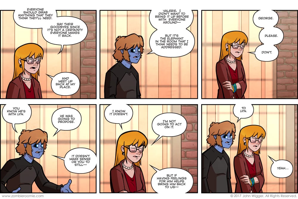 This one has been in the plans since he beginning of the prep for this arc. Valerie will be in a fair number of strips this Summer and Fall and she still hasn't really gotten closure from her initial exit and the circumstances surrounding it. George might seem harsh to her, but the way I'm looking at it is, he's being a friend to John and Lyn first.