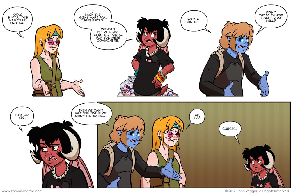 There's some intense stuff coming up in this arc, so I wanted to spend some time being more lighthearted where we could be. Next week we actually arrive in Hell so that'll be fun. I'm looking forward to some new characters and designs. Should be interesting strips to work on.