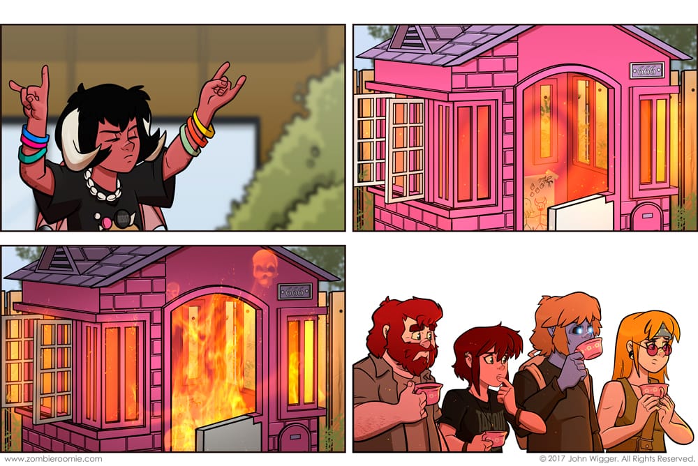 This one's joke came from the throw away line I added at the last second to Tuesday's strip about them having tea... I think it paid off. Plus, Sin in panel one is freakin' adorable. Next week they're in Hell. It should be fun.