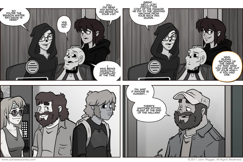 There was several versions of this strip in the outline... but in the end, I went with this. Kim has already let us know that there's security cameras so they know John tossed the plant. But what are you going to do to a guy who shouldn't even be processed? Send him to Hell? That's just more paperwork.