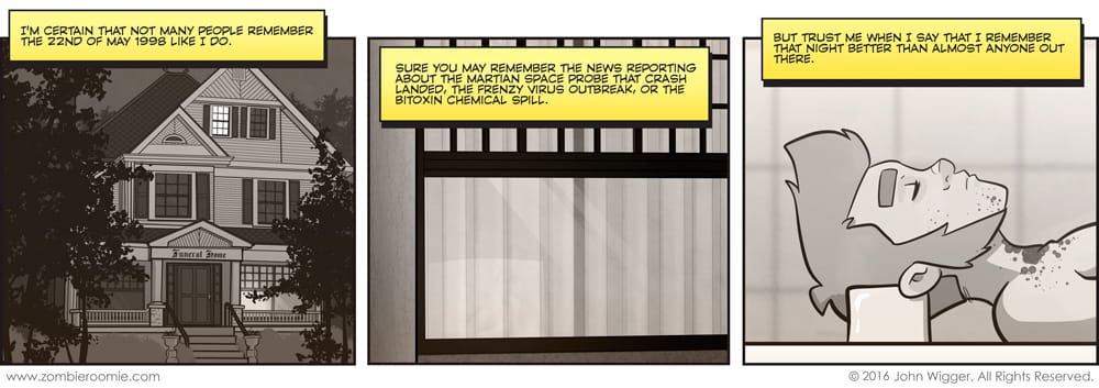 I spent a stupid amount of time on the house for panel one. Way, way longer than I'd like to admit. This arc is a lot shorter than the last one, but I've wanted to tell this story for a long while. Initially I came up with it for a bonus arc that would only be included in a print version of Zombie Roomie, but I decided that the information that we'll learn is too important for only a select few to know. Especially in regards to future story lines and whatnot. But seriously, I spent too long on that house...