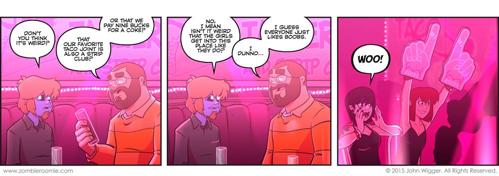 This strip comes from an idea that spurred a drawing I did last weekend. I had a conversation with a friend about needing a foam finger to show my support for boobs.... So this is what I was thinking it would be like. That was my design for it and I thought it would be a good souvenir for the strip club. But my friend thought it was too tame... her idea was much, much dirtier. It's one of the reasons I like her. And no, I'm not going to mention what her idea was...