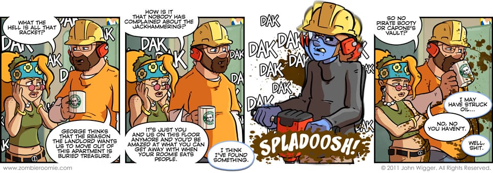 I'm pretty sure the guys aren't going to get their security deposit back anymore... One of the harder parts of this comic was figuring out the onomatopoeia for the sound of a jackhammer... dak dak dak repeated ended up being pretty close. I like sticking the guys in costumes and wacky props so when I had the idea of George tearing up the kitchen floor in search of treasure I wanted to stick them in hard hats and ear protection. I think they're the required level of goofy.