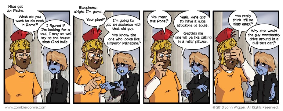 Wow. One-hundred comics by me... That's a milestone. Zombie Roomie has come a pretty good ways in that period of time... no really, go back and check out the early strips. I think I've grown a lot since I started back in October. The next big milestone I'm looking towards in the one year anniversary. That'll be a big one. I'm pumped. Also, the Pope totally looks like the Emperor.