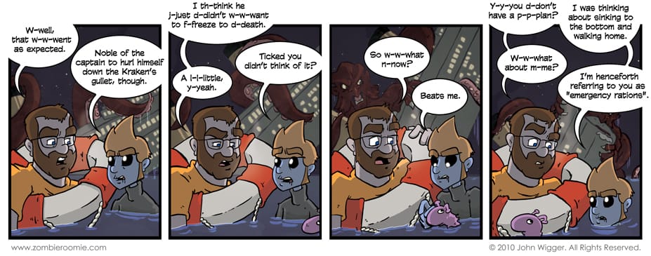 RELEASE THE KRAKEN!!! Well, it seems out intrepid "heroes" are lost at sea. However will they get out of this situation? Find out Friday... Same Zombie Roomie station... err, URL or whatever... well, you know the routine.