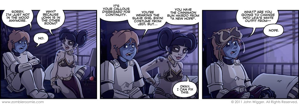 This gag was what I thought of that spurred me into putting George and Zoey into the costumes they wore on Monday and why that comic was a setup for this. I'm super proud of panel one. The lighting, the drawing of Zoey, both character's body language... I just think it's a really strong panel. I've got my next major storyline planned, designed as the two year anniversary arc, but before I start that story I've got time for a few one-offs or short bits that would include the supporting cast. Is there anyone that hasn't been a featured player lately that you'd like to see me tailor a strip or two about? Lemme know in the comments. Speaking of comments, you can now use your Twitter, Facebook, or Google accounts to comment on Zombie Roomie. It will use your avatar/username from said account and everything... It's pretty cool. So give it a try~!