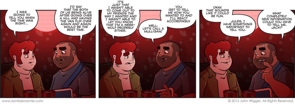 I wanted to end this arc on a good place with Jack and Jules. If you are a Patreon patron at the $10+ a month tier, you would have known that Jules wasn't a fan of body hair. But he's making compromises and changing his world view now that he knows about werewolves and other supernaturals... His beard is just one representation of that. Tomorrow has another wrap up bit and then we're on to something else next week. I'm thinking it's time to revisit Drew and Buffy. For those who have forgotten Drew is the ghost of John's previous roomie and Buffy is the stripper he's been living with since he stopped haunting John and George.