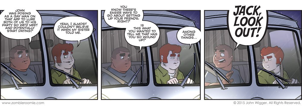 Jack was able to tell Jules one thing at least. I like that the windshield wipers follow Jack's eye line. I initially hadn't planned that, but after I was pacing out the dialogue and planning the character art sketch... I thought it was kind of nifty. I'm going to have to draw a bunch of vehicles for the bit and I'm not looking forward to it. And yes, this is why the arc is titled, "Crash".
