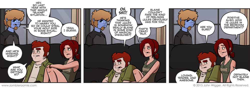 I wanted George just to plant the seed of the worry in Jack's brain... I thought about having him just leaving after dropping the idea... but having him appear uncomfortable in panel three was worth keeping him in it for me. I haven't been super happy with Lyn's look in the last few strips so before I started working on this strip last night I put in some time reworking her. Panel two I think is super successful. I'm still tinkering with her design, but I think it has some promise... and she's still adorable. We're getting close to me being happy with the looks of the characters I've been using lately... only John really sticks out to me as needing a lot of work (mainly his beard area). That can only mean I'm about to really hate my entire style or something soon. I'm kind of insane in that regard. I've seen a few people who have been getting the wrong idea of how Blaine's plan actually worked. He found a Native American ritual for werewolves that would allow one werewolf to pass the wolf side to another family member... since werewolves are a genetic condition and it's a trait that is passed down through bloodlines. Think of it like a grandfather, who is a werewolf, is dying and his grandson, who wasn't born with the werewolf trait, is willing to take it on... they can have the ritual that Blaine found performed and the grandfather passes his werewolf side to the grandson. There's only one werewolf between the two of them still... and it's not that anyone in the family automagically becomes a werewolf. So Jules wont become a werewolf just by marrying Jack. Also, John wouldn't become a werewolf either if he were to marry Lyn someday. To have that occur they would have to have the ritual ceremony performed and either of the current werewolves would end of losing their respective wolf side. I hope that makes more sense for those who were confused.