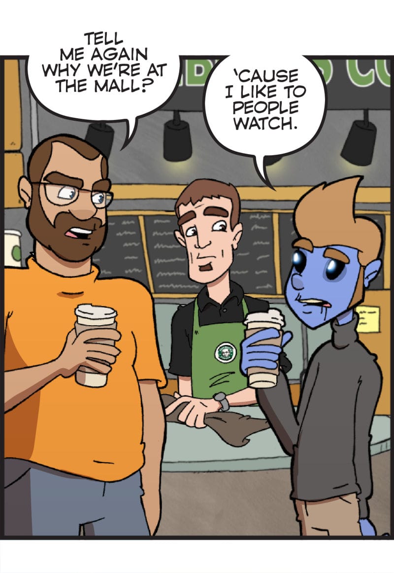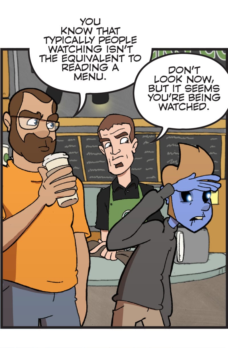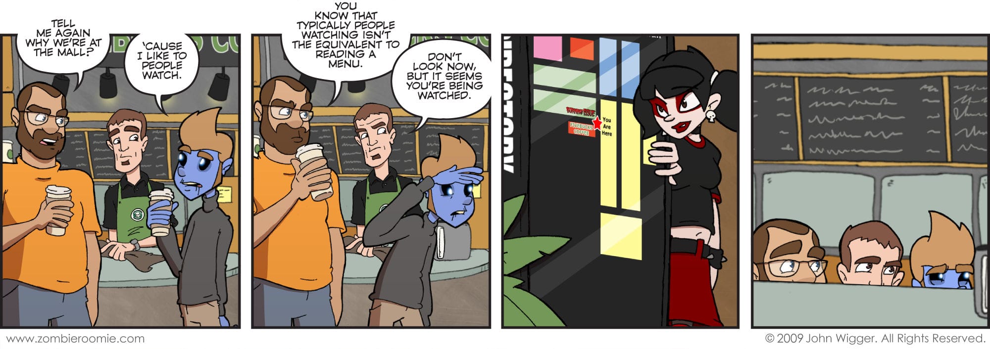 We leave the apartment for the first time in the strip. Also, we're joined by a new character and a cameo. Who is this girl? Find out Wednesday.