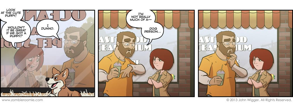 This was just a silly thing I came up with a while ago that I thought would be a decent one off gag. It's a neat little thing in the world building of the comic to have a pet store owned by someone in the cast, so I'm able to have that location in the town and it's not a stretch in that regard. For those of you who haven't caught up with the archive, the girl is a werewolf. And for those of you wondering, yeah, I'm playing around with Lyn's hair. I'm trying to get it just 'right' and this is closer, but I'm going to do a few more passes before I call it done.