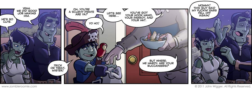 Apparently I didn't get Halloween out of my system with the strips from Friday through Wednesday... so today's was a trick-or-treat based strip too. It's actually based on a really old joke that my Mom first told me, but I gave it a little twist with the Steins. I have shown Karl, Francis' son, before... but this is the first appearance of Elsa his ex. The bride of Frankenstein was never named, so I didn't have much to go on when naming her... so I checked on IMDB and found out that the actress who played the Monster's mate was Elsa Lanchester and I borrowed her name. I didn't want to have her design be a full on reference to the bride, so I changed her hair from the Marge Simpson/ fright wig to a pixie cut... I kept the streak in her hair though. This is the first time I've uncensored the f-word. I wasn't sure if I should or not, but when discussing whether or not to do so with other creators the consensus was not to since it was the punch of the punchline.