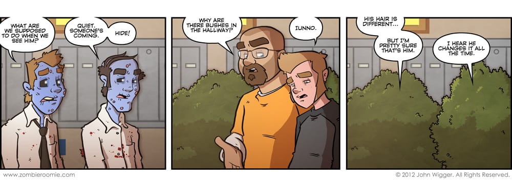 This might be the first in-canon story comic to reference George's hair cut changing from time to time. I changed it from his original spiked pompadour to the Skywalker inspired 'do in a 4th wall breaking strip... but I don't recall mentioning the other changes I've done to the Skywalker or back to the spike. I could be wrong as it's been a little while since I've gone back through and read all of the archives. But for those of you missing having zombies in Zombie Roomie... this arc is for you! There'll be more zombies in this storyline than there's ever been before!