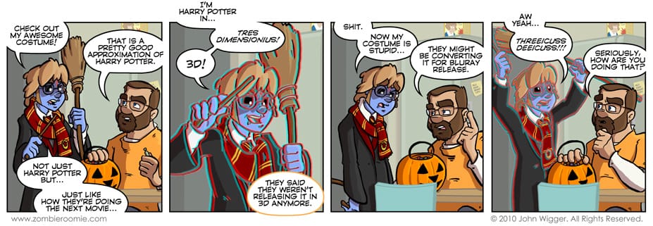 Like last year, I'm doing two Halloween strips... this being the first. The ability to do stuff in a comic strip world that is impossible to do in the real world is something I really enjoy about doing Zombie Roomie. Last year, the guys were done in Black & White to mimic Romero's "Night of the Living Dead" characters,.. sure I said they were wearing makeup... but, this year George got all 3D-ified to take it to the extreme. I'm not a super Harry Potter fan. In fact I haven't read a single book... but I do really like the flicks. I wanted to have the guys step away from the standard Star Wars or Star Trek costumes... and I've had them dress up in both Marvel and DC based superheroes... I needed to hit some other aspect of dorkiness. Enter George as Harry Potter. It was a very fun costume to draw. There's several props that are needed to sell the look... and folks that actually read this section or my tweets know I love sticking the guys in costumes. For the content, I keep up with lots of entertainment news sites and last week or so I read an article about how Warner Brothers was no longer going to release The Deathly Hollows in 3D and then soon after how they were possibly going to change their minds and do the conversion for BluRay. That inspired this strange comic.
