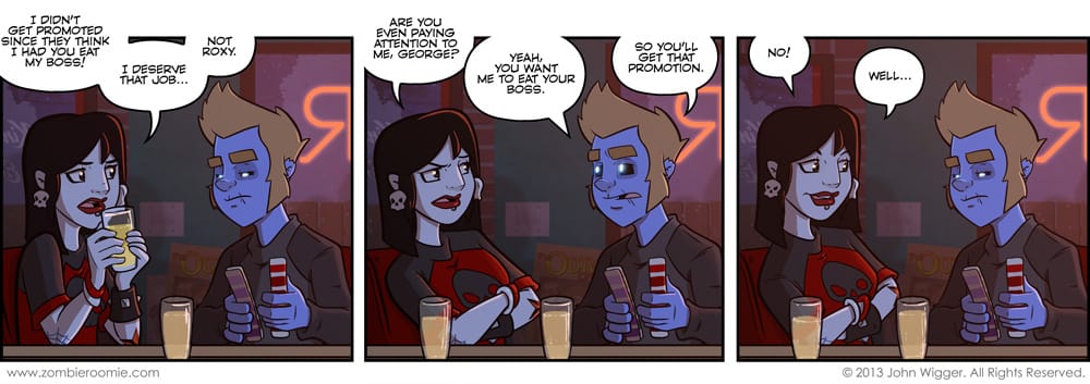 I wanted to have a nice little conversation between George and Zoey to let the two of them catch up... George is just a little preoccupied though. We'll see what his mind is on soon enough. When planning this strip, I had to decide on where to place them... If I had them at their apartment, George not paying attention could be misconstrued as him watching television or something. With them out the paint strips are definitely his focus. I'm realizing the time until Christmas and where we're at with this story and coming to grips that we wont have a Christmas based arc again this year. Last Christmas we were finally wrapping up the George gets rezombiefied arc at this time. I guess this makes up for having the previous Christmas arc lasting into April of 2012...