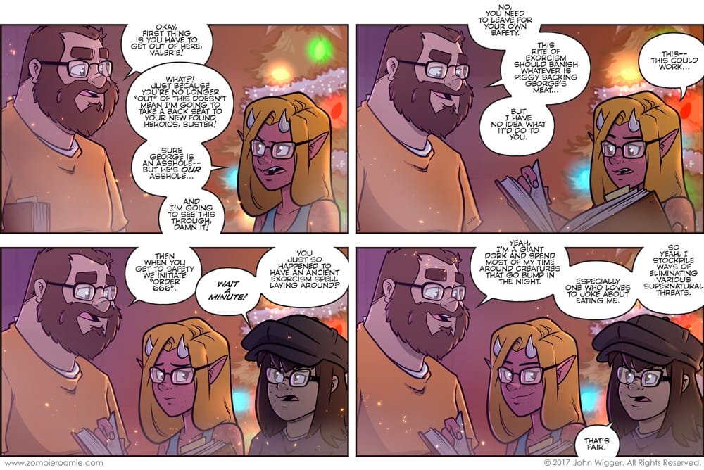 The way I see it is it's kind of like what Batman did where he figured out how to defeat each of the other members of the Justice League and then like he kept going to figure out other contingency plans. The tree shows that it's sometime in December in this arc. I needed more background stuff for this strip and seasonal stuff like that helps ground when things are taking place... so it worked.