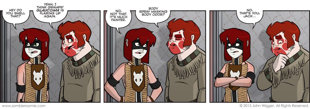 It was really hot out and Jack's much more of an air conditioning fella... We're going somewhere with this but I've mentioned that Jack wears a lot of body spray in the past and I wanted to have Lyn find what she finds in tomorrow's strip logically. What does she find? I'm not telling you that. If I did I wouldn't have to draw tomorrow's comic. Wait, would that work? Nah, let's not go down that path. I played around with Lyn's look some more and I really like how she came out in panel one. I'm going to push myself to keep up with that as her new standard.