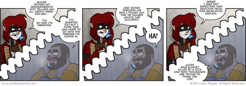 The problem with exposition that the audience already knows that the characters are just learning is that it's boring to focus on them learning it. So we skipped that and we just get to have Lyn's reaction. Plus it let us catch up with the other party to see where John is. There's more that Lyn will figure out in regards to what her grandparents told Blaine and other things he learned from the information at the farm, but she was far too pissed to listen just now. I really dig Lyn in this strip. I've gotten her to a point that I feel her design is quite successful. Even though it's not at all related, getting her design spot on makes me feel bad for Zoey... since I'm really not keen on her look right now. That's a big reason I haven't been using her as much as she deserves. I have a Zoey-centric arc, her going to college, for the Fall that I need to get her look dialed in for. Like I said it's not related to this arc, but sometimes I just ramble in this little blurb. This has been one of those times.