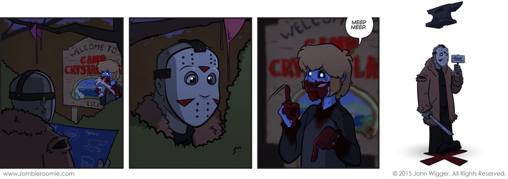 If you forgot, last month we had the first part of this. I know this isn't a particularly "smart" comic... but since Jason is a mute character I thought of the roadrunner/coyote gag and this was the "logical" outcome. We'll get back to the relationship stuff for next week... I just had to duck out to this due to the date.