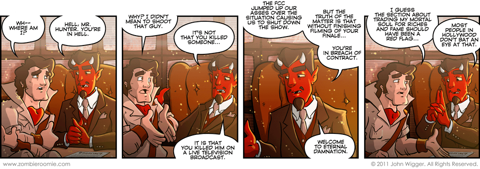 For those playing along at home... today is Zombie Roomie's 2nd anniversary. This comic has a callback to something that happened in the first year of the strip... where George tries to fiddle duel the devil for a soul. You see, the network guy that we've been dealing with on the Hunter show has been the devil all along. If you notice, he wears the same suit as the devil did even while in his human form. What does he have in store for George? Does he care about John stealing his fiddle? Why did he want George to take a dive? We'll have to wait and see for when we get back to him and possibly Hunter at a later date.