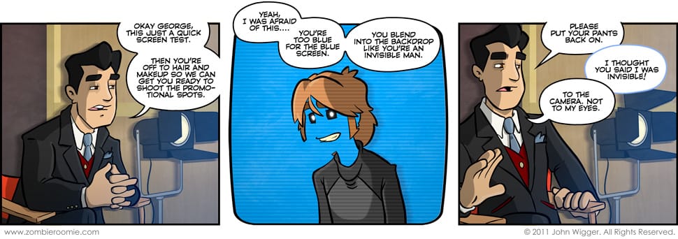 Other than the Avatar gag with George being blue... I always had the idea of doing something with a blue screen and how he'd be see through in his skin areas. I know most places use green screen for their big budget stuff, but let's say the Hunter: The Zombie Hunter show is cheaper than the cutting edge for compositing.