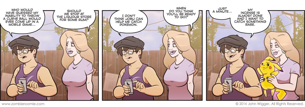 I figured we needed to have a Pokemon Go strip and Lizzy was the best candidate to have in it... I don't know when we'll get back to the reunion arc... but it'll happen eventually. When it does we'll likely revisit what happened at the actual reunion festivities via a flashback since it's time we got Lizzy and Glenda back with the regular cast. And I know Jobu helped Cerrano hit curveballs... I just figured he'd know how to throw them too.
