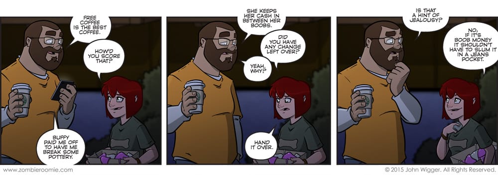 This wasn't a planned comic but early this morning I was working on the planned comic and I hated everything but some of the art. So I scrapped it and came up with something that played into yesterday's strip. It's silly and I know it. But I like when I'm able to do something silly with ZR. I sometimes have to remind myself that it is a comic strip and not everything needs to be deep or meaningful. The charm of ZR shows through in silly character beats like these.