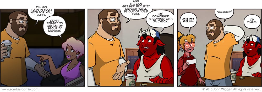 I really dig on the art for Valerie and the fat demon in this strip. Fat demon in panel two is pretty great if I say so myself. We're wrapping this arc up soon. Maybe Monday or Tuesday it'll be pretty much done... I just have to make sure what I want to get done can be done in the strips I'm planning.