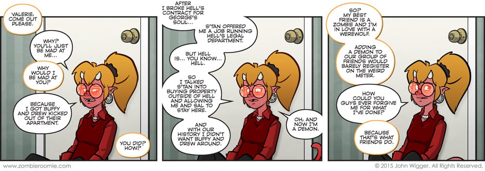 I've been wanting to include more demons for a while since I dig the red skin tones. We'll have Valerie and Sal (the big fat demon) more than S'tan (the guy who tricked people into thinking he was The Devil). While reworking old strips for the printed ZR books, I grew fond of Valerie again. I had originally thought she'd only be out of the comic for maybe six months and instead it was years before we saw here help George out of his contract. It had been a while since she had done that too as I had a problem coming up with a reason for her to just be back again. I didn't want to have her just go hippie again and move back to her apartment like her lawyer side never happened. I wanted to keep that side to her as I felt it brought a fuller picture to who she was. Having her become a demon fulfilled a couple things for the comic.