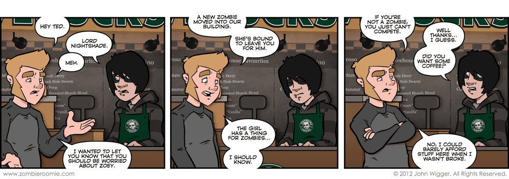 Okay, so we're getting somewhere. I've wanted to have more interaction in established locations... like the Fivebucks Coffee shop in today's strip. That's one of the reasons for Ted Lord Nightshade working there... Another is that Zoey and Lizzy frequent it and it's directly across from Burning Issue where Zoey works.
