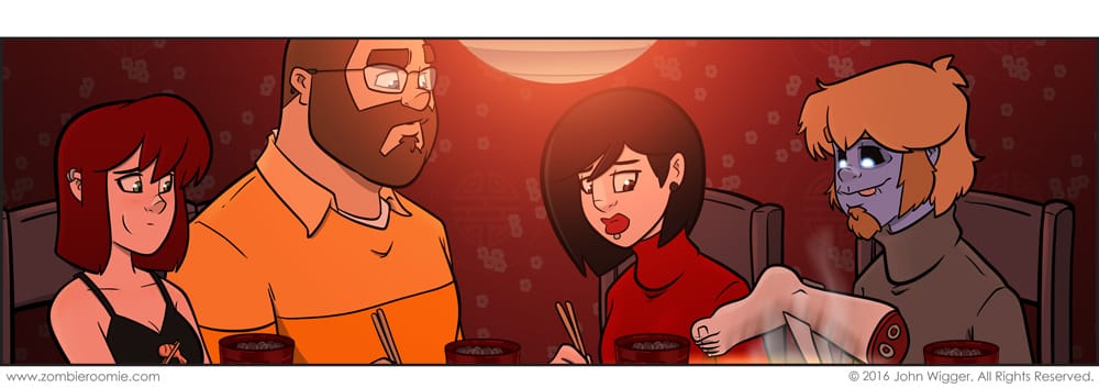 We felt we needed an intermission for the Glenda/Lizzy story so something silly like this was the first thing that came to mind. It's a lot like old ZR strips where folks were dealing with George eating people. I've been to a Korean barbecue place twice during my trip where you grill your own meats at the table and it spurred me to thinking of a double date with a zombie at that type of place.