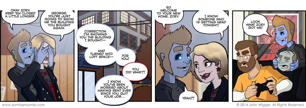 Here's Zoey's first in comic debut of her new look. It's still a work in progress and I'll be fiddling with her hair a bunch... along with how it'll change how I do the other character's hair as well. Some of the issue is from how I do environmental lighting/etc. and the technique I used for her hair highlighting not playing well together. Some other issues come from needing to practice it a little more as well. But yeah, there's going to be another move in their future. I've been wanting to have them move for a while. I'm looking forward to the change in the apartment local. And yes, George did buy this building before Zoey quit her job. He just had the construction crew working overtime to get it done sooner rather than later to accommodate the change in scheduling due to her employment status. He was planning to surprise her with the new living space in due time, this just sped things up for them and us.