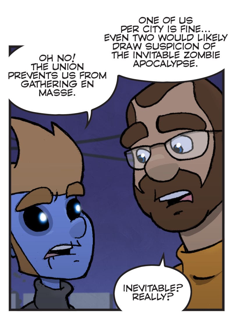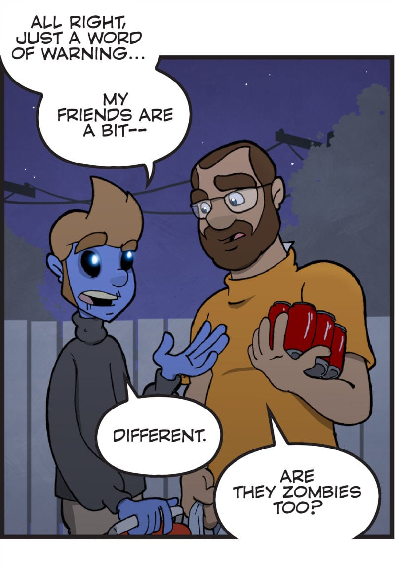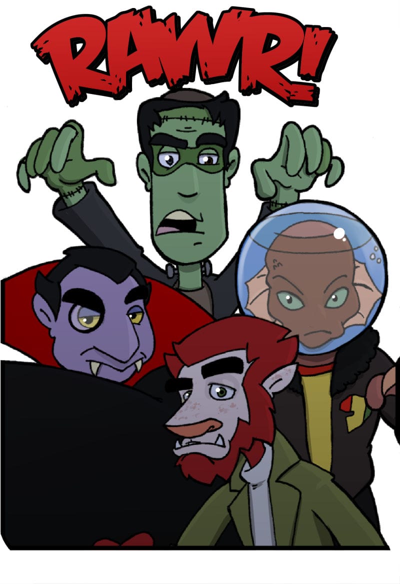 So, we meet George's friends... In the coming strips we'll find out their names and some of their back-stories. I kinda dig the backlighting on the Monsters... it's close to how I played with shading originally when I was working on a visual style for this strip. I'm going to see about working on it some more to get the eventual shading look for Zombie Roomie. Also, I was discussing using silhouettes on Twitter so I wanted to try the practice. I'm going to do some more sketching with silhouetting the characters and see if I can't make them even better for later attempts at it.