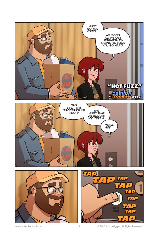 This is a blatant advertisement for my Patreon. I admit it. Over on Patreon, I'm starting the longest NSFW story that we've ever had... it'll end up being twenty something full sized comic pages worth of naughtiness. This will be the only free page of this story you'll see. To continue getting the rest of the story you'll have to become a $10+ a month patron. Patrons at that tier and higher have access to all of the NSFW content that I do and will get to see the rest of this story as it is published. So join my Patreon campaign and help support me and Zombie Roomie... and get extra comics in the process~!